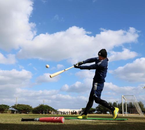 近本が謎の細い棒を練習に取り入れた。91センチの木製で、ティー打撃の合間に右手で強く振った。腕に刺激を入れることが目的。適度な棒を探して、鹿児島に本社があるホームセンター「ニシマタ」で110円で購入。ただ強く振りすぎてポキッと折れてしまった。「70円分くらいになっちゃいましたね。でも長すぎたのでちょうどいい」と短くなった相棒を大事そうにしまった。この日は初めてロングティーも行った。