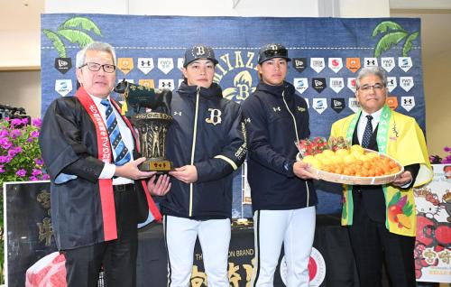 宮崎でキャンプを張るオリックスにJA宮崎から宮崎牛50キロ、きんかん「たまたま」など地元産フルーツ各10ケースが贈呈された。