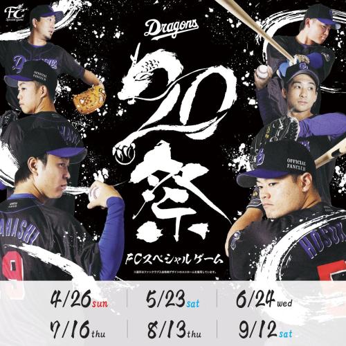 今年で創設20周年を迎えた中日ドラゴンズ公式ファンクラブの誕生20歳を祝う「20祭」をテーマに、FCスペシャルゲーム全6試合を開催する。