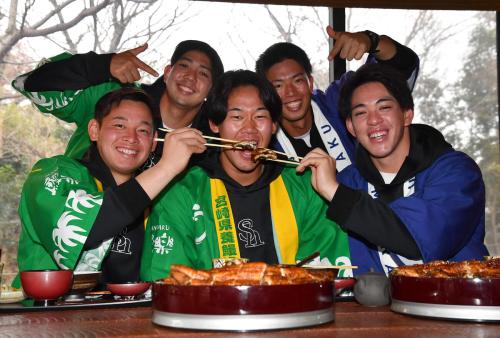 ソフトバンクのドラフト3位鈴木豪太投手(22=大商大)が5日、初のキャンプ休日に宮崎市の「鰻楽(まんらく)」で「うなぎのつかみ取り」体験を行った。