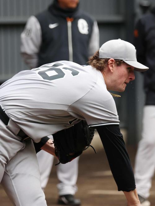 201センチの長身から投げ下ろす直球は、最速153キロを計測。「(出力は)8、9割。調整段階としては思っているところにいる」と頼もしい。この日はカーブ、カットボール、チェンジアップも交ぜて36球。球数少なめに仕上げていく自己流を日本でも貫く。見守った杉内投手チーフコーチは「球、速かったね。えげつない球」と第一声。「誰かいるかな。あまり見ないもんな」と独自の長身投げ下ろしスタイルに目を見張った。