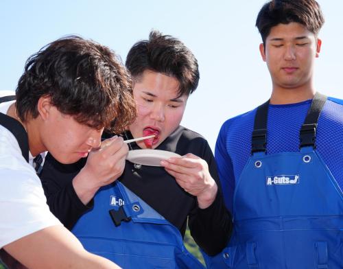 試食の際にはおいしさのあまり、ルーキーたちは思わず無言に。夢中でマグロを頬張った。小田は「餌をあげた瞬間に(マグロの)大群がバーッときた。想像より迫力がすごくて、良い経験ができた。楽しかったです」と、キャンプでの初休日を満喫した。