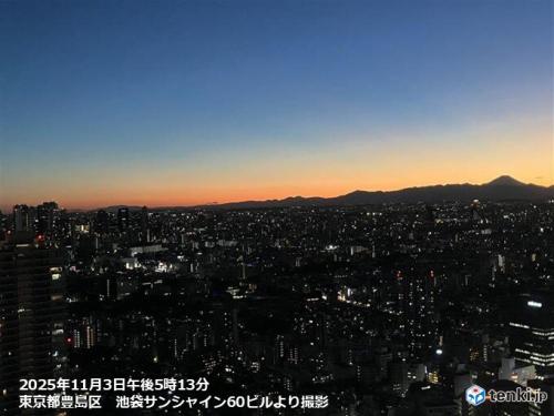 今日3日の日没後、東京都心では、オレンジから群青色のグラデーションに空が色づきました。日没後や日の出前の30分間は、空が美しいグラデーションを描くことが多く、マジックアワーとも呼ばれます。今日3日の東京の日の入りは午後4時44分で、写真は午後5時13分に撮影されました。昼間、東京都心では、北風に雲が流されてくる時間もありましたが、今夜はすっきりと晴れて、冷え込みが強まる見込みです。