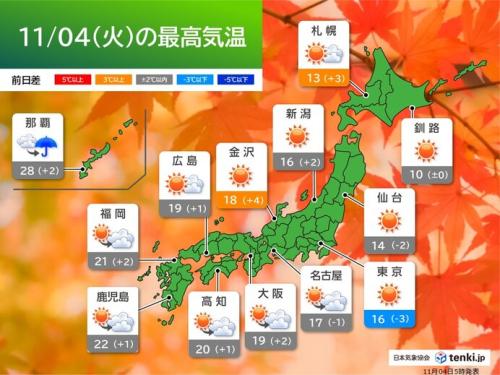 最高気温は九州から近畿では20℃前後、東海や関東、北陸は16℃から18℃くらい。東北は15℃前後、北海道も10℃を超える所が多い見込みです。平年並みの所がほとんどですが、東京都心や仙台は昨日3日より低く、11月中旬並みの肌寒さでしょう。