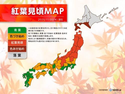 中国地方は朝の冷え込みが強まり、街路樹が色づきはじめています。今週末は8日(土)の日中は晴れて、行楽日和となるでしょう。ただ、9日(日)は広く雨となる見込みです。また、晴れる日は朝晩と昼間の寒暖差が大きく、空気も乾燥しやすいため、体調管理にお気をつけください。