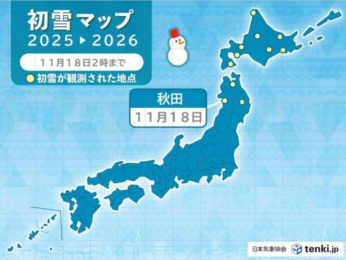 18日(火)未明、秋田で初雪が観測されました。平年より3日遅く、昨年と同じとなっています。