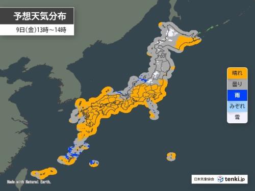 最高気温は、昨日(8日)と同じか低めの所が多いでしょう。