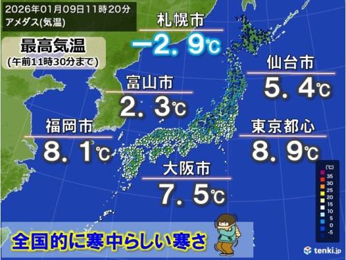 午前11時30分までの最高気温は、東京都心は8.9℃、大阪市で7.5℃、福岡市で8.1℃など10℃に届いておらず、厳しい寒さとなっています。富山市は2.3℃など北陸は雲に覆われたままで、凍えるような寒さです。