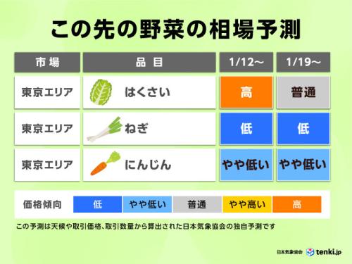 日本気象協会の調査によると、1月12日週から東京エリアでは、はくさいの価格が高騰することが予想されています。ただ、これも一時的で、19日週には落ち着くでしょう。