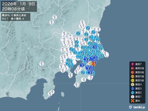 9日午後8時8分頃、千葉県北東部を震源とするマグニチュード4.7の地震が発生し、千葉県で最大震度4を観測しました。この地震による津波の心配はありません。