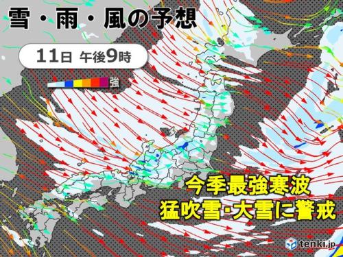 今日11日(日)から12日(月・成人の日)にかけて冬型の気圧配置が強まり、今季最強寒波が襲来するでしょう。北海道から九州の日本海側を中心に警報級の大雪や猛吹雪の恐れがあります。普段雪の少ない東海や四国など太平洋側にも雪雲が流れ込み、積雪となる所があるでしょう。車の立ち往生、新幹線や列車の運休、遅延など交通機関が乱れる恐れがあります。