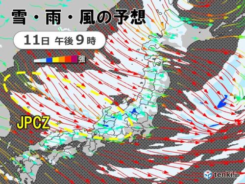 上空の強い寒気とJPCZの影響で、北陸付近には12日(月・成人の日)の明け方にかけて活発な雪雲が次々と流れ込み、平地も含めて今季一番の大雪となる恐れがあります。