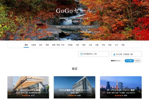 一休は、旅行予約サイト「一休.com」で、「GoGoセール」を10月14日正午から15日まで開催している。