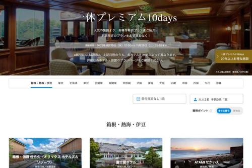 一休は、宿泊予約サイト「一休.com」で、「一休プレミアム10days」を、11月19日正午から29日まで開催している。