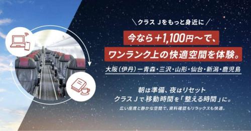 通常の差額(2,200円から)を引き下げ、1,100円から利用ができる。対象路線は大阪/伊丹~青森・三沢・山形・仙台・新潟・鹿児島線で、対象機材はエンブラエルE190型機の直行便に限る。新潟・鹿児島線は差額に550円を加えた額からとする。