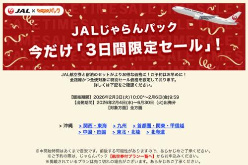 リクルートは、旅行予約サイト「じゃらんnet」の国内線航空券とホテルなどがセットになったダイナミックパッケージ「JALじゃらんパック」で「3日間限定セール」を、2月3日から6日まで開催する。