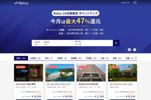 Loco Partnersが運営する宿泊予約サイト「Relux(リラックス)」は、ポイントアップキャンペーンを4月6日から15日まで実施する。