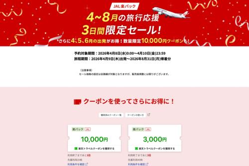 楽天グループは、旅行予約サイト「楽天トラベル」で、日本航空(JAL)のフライトと宿泊がセットになった「JAL楽パック」で4月8日から10日までセールを実施する。